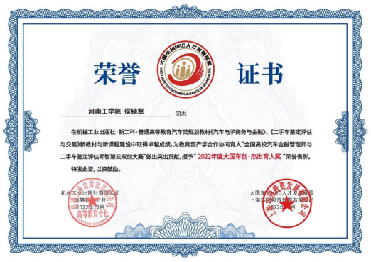 最后,机械工业出版社对新工科·普通高等教育汽车类规划教材《汽车电子商务与金融》、《二手车鉴定评估与交易》及课程资源建设中取得卓越成绩的43名高校教师授予“2022年度大国车创·杰出育人奖”荣誉表彰,侯锁军院长等4人获此殊荣。