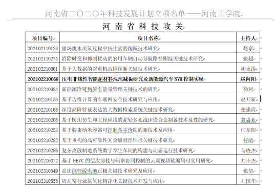 我院赵向阳副教授主持的“压电非线性智能超材料混沌减振研究及新能源汽车NVH控制实现”项目成功获得2020年度河南省科技攻关立项,获批经费10万元。历年来我院高度重视科研申报工作,2018,2019、2020年度连续三年获批省科技攻关项目3项,获得科研经费30万元。