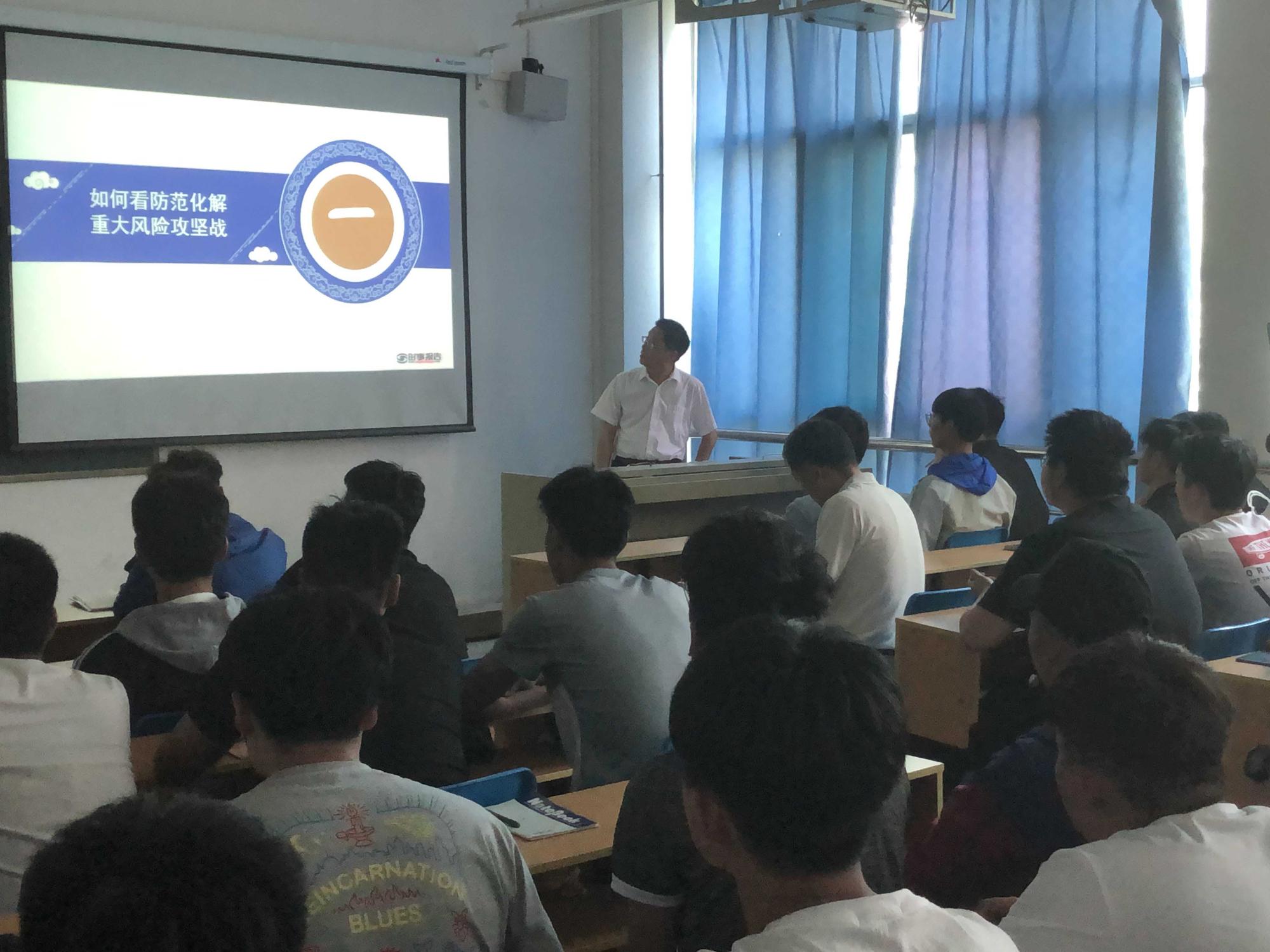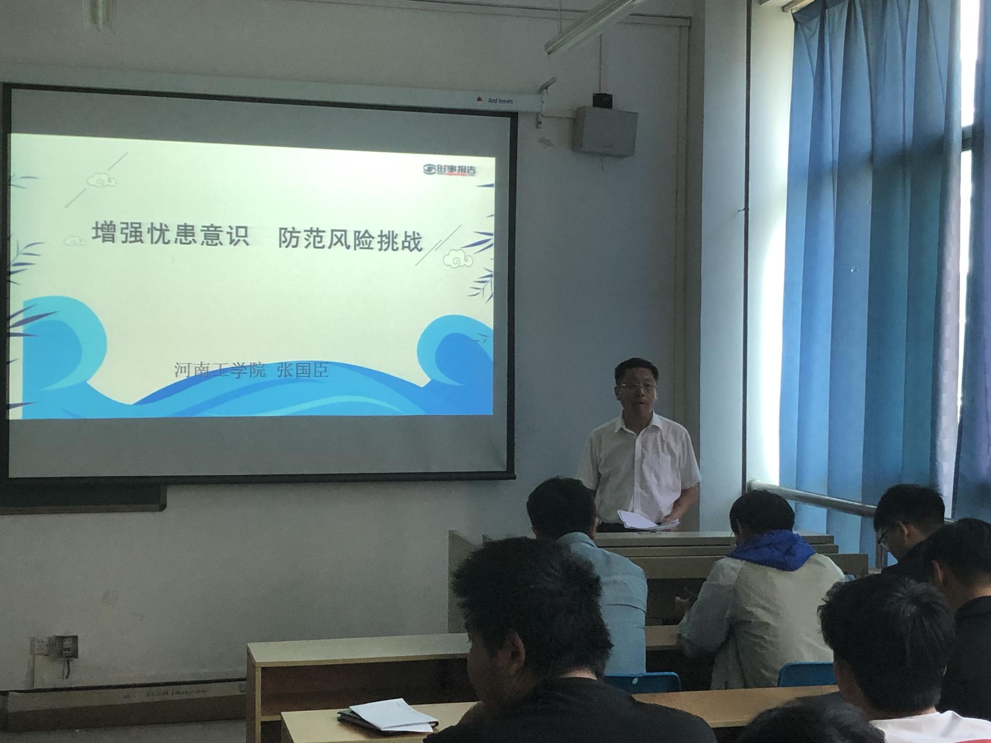 张国臣站在讲政治的高度,从十九大报告“要坚决打好防范化解重大风险、精准脱贫、污染防治的攻坚战”引出本课题目“增强忧患意识,防范风险挑战”,接着从三个方面进行了讲解。首先,他向同学们讲解防范化解重大风险攻坚战的重要意义,不仅关系到我国现代化建设的伟大进程,也要注意防范“黑天鹅”和“灰犀牛”现象。接着用具体事例向同学们讲解了我国当前化解重大风险的举措。最后张国臣向同学们讲解了作为新时代大学生要树立应对各种风险挑战的坚定信心,一是同学们要切实增强防范重大风险意识,充分认识防范重大风险的极端重要性;二是要努力提升化解重大风险能力,要善于学习,加强理论修养,从学习中提高防范化解重大风险的能力;三是要认真落实化解重大风险举措,防范化解重大风险,不能只喊“口号”,要落实到行动上,要有具体的举措、办法和制度。