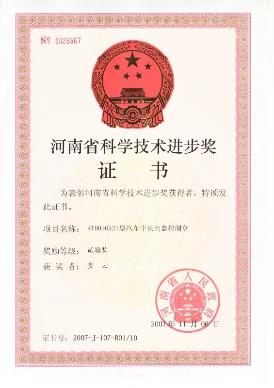 该中央电器控制盒、灯光检测器是我院教师与新乡市荣泰电器有限公司联合研发的系列产品,其主持研发教师是我院娄云教授。中央电器控制盒获得了2007年河南省科学技术进步奖二等奖,全电子汽车灯光检测器获得2009年河南省科学技术进步奖三等奖,并且该系列产品广泛应用于国内主流工程机械厂家和客车厂家。