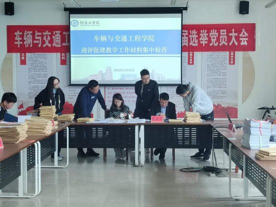 为做好河南工学院院(部)教学工作检查工作,持续规范学院教学过程形成性资料和教学档案科学管理,高质量通过教育部本科教学工作合格评估。2023年4月15日上午10:00开始,由车辆学院评建工作领导小组对学院2022全年的教学材料进行了集中检查。本次检查由侯锁军任组长,赵向阳和刘刚任副组长,睢利铭担任联络员,苏晨,温永美,金毅负责各教研室资料检查,对试卷类、非试卷类课程考核、实验、实习(实训)、课程设计、毕业设计等环节的教学材料进行了100%全覆盖的检查。