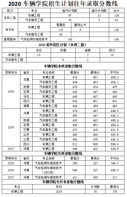 2020年车辆学院招生计划及往年录取分数线