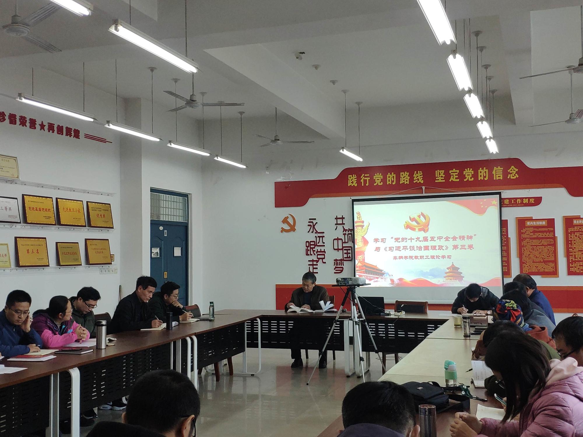 11月5日下午,车辆学院党总支理论学习中心组学习(扩大)会议在教4#211会议室召开,传达学习党的十九届五中全会精神与《习近平谈治国理政》第三卷,研究部署学院党总支贯彻落实工作。会议由院党总支书记段维峰主持,院总支党委委员、中心组成员及全体教师参加会议。