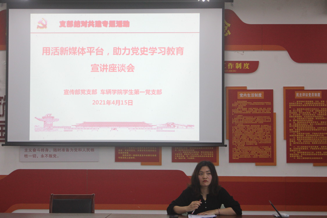 为进一步加强校院基层党组织之间的沟通和交流,实现资源共享、优势互补,2021年4月15日,校党委宣传部党支部与车辆学院学生第一党支部在教学4号楼211教室开展结对共建“宣讲座谈会”活动,本次活动邀请了校宣传部副部长张希玲老师、孙夏夏老师,车辆学院副书记郑峰、辅导员侯安娴老师、新媒体中心成员和车辆学院学生第一党支部全体学生党员参加了本次座谈会。