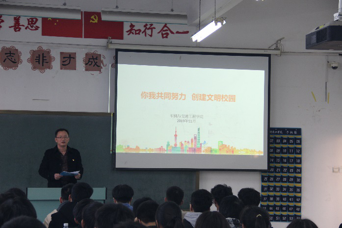 11月18日—11月20日期间,机关党员干部利用课前十分钟的时间,为车辆学院学生开展“你我共同努力、共创文明校园”小讲堂活动。校纪委副书记侯存敏阐述了同学们参与文明校园创建活动的重要性,讲解了文明创建的要点知识;宣传部宋屹东老师,结合自身所学专业,引导学生坚定理想信念,提高思想道德修养,弘扬和践行社会主义核心价值观,积极参与文明校园创建活动;组织部马睿、党委办冯伟、统战部张宁三位老师按照文明礼仪的具体要求,结合同学们的日常行为规范,引导同学们养成良好的文明素养,从现在做起,争做文明建设的先行者和传播者。