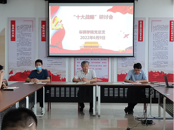 为深入贯彻落实省委教育工委办公室《关于组织党员进党校学习“十大战略”的通知》要求,引导广大教师党员关注省委部署的关键性、战略性、全局性工作,结合学校“能力作风建设年”活动安排及党员教育培训工作实际,2022年6月9日下午,车辆学院于教学4号楼211组织开展了“十大战略”学习研讨会,全体教职工出席了本次会议。会议由副院长侯锁军主持。