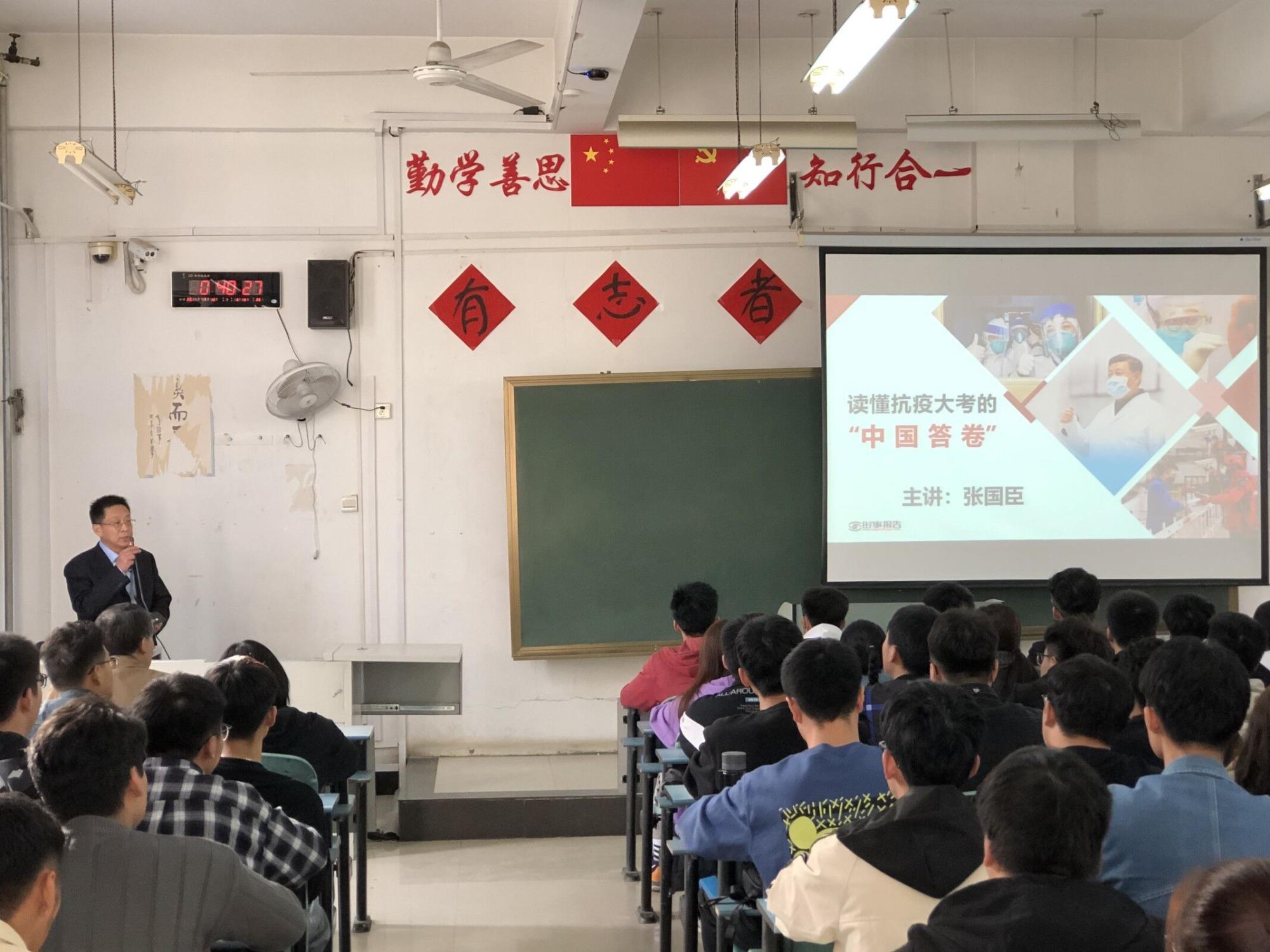 党课开始,张校长上台以“抗疫大考下的中国答卷”为主题进行演讲,讲述了在抗疫期间所出现的种种抗疫事件,赞美了在疫情中无私奉献的白衣天使和解放军战士以及所有无名英雄们,并带领全体学生们观看有关抗击疫情的视频,视频内容反映了在疫情期间中国人民所体现出来的坚韧、顽强、无私奉献的精神。之后,张校长又为学生们讲述了要成为一名共产党所要具备的条件,介绍了属于每一位共产党的权利与义务,并强调,要成为一位共产党员必须要拥有勇于担当、勇于作为、不畏艰险、艰苦奋斗的精神。此次党课在学生们的掌声中圆满结束。