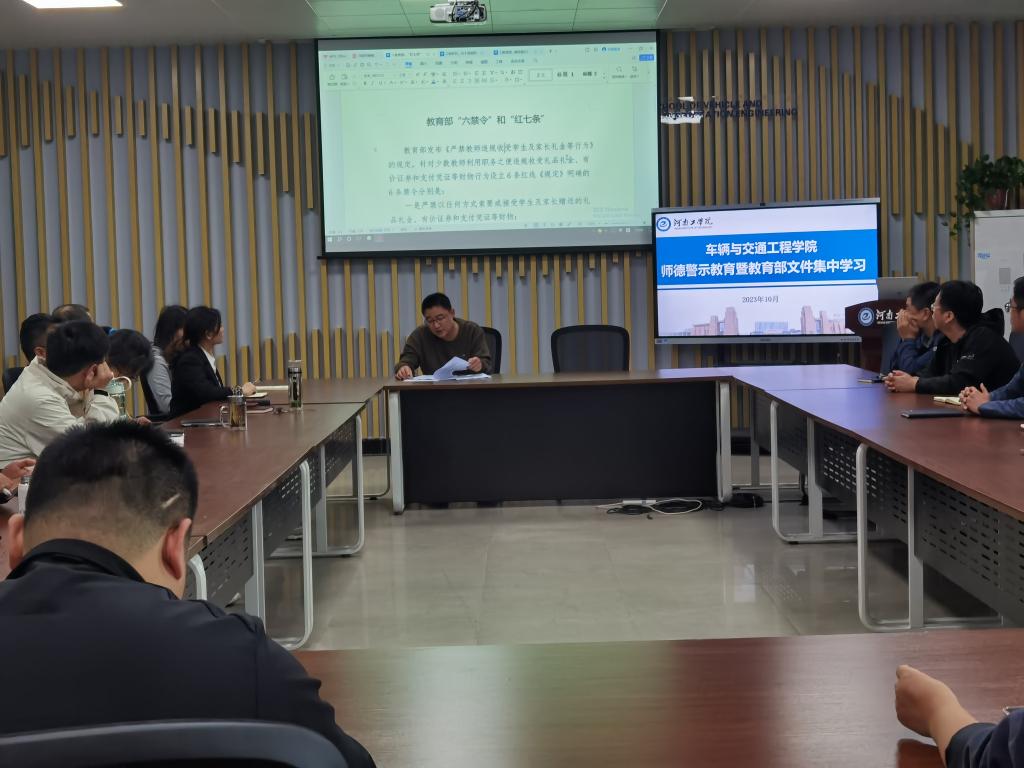 为贯彻落实河南省教育厅等七部门《关于加强和改进新时代师德师风建设的实施意见》文件精神,进一步加强学院教师师德师风建设,切实提高广大教职工规矩意识、底线思维,10月19日,车辆与交通工程学院组织召开师德师风警示教育会议。