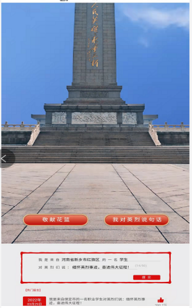 对于本次主题班会,各班同学都积极认真对待,班会开始后,先由班长上台介绍本次班会主题及流程,畅谈自己的心得体会,并鼓励台下同学自由发言。班会开展过程中,气氛活跃,同学们积极发言,纷纷讲述了自己所了解的先烈故事并表达了自己最崇高的敬意。同学们登录中华英烈网的“祭奠烈士” 专栏,并以鲜花祭祀、丝带祭祀、寄语书写等方式缅怀先烈、追思先人。