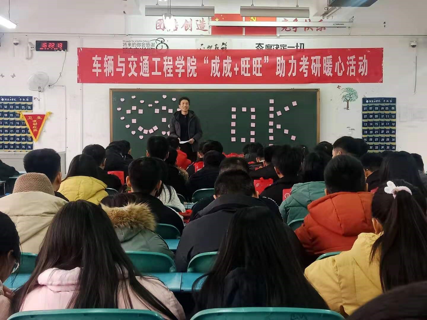 为增强考研学生迎战考试的信心,鼓舞学生的士气,让学生以最好的状态、昂扬的斗志投入到考试中去,车辆与交通工程学院于2020年12月10日下午四点半在教一C502举行考研暖心活动。车辆与交通工程学院郑峰书记、团总支副书记韩张娜老师、辅导员张虎、盛青志老师以及全体考研学生参加了此次活动。