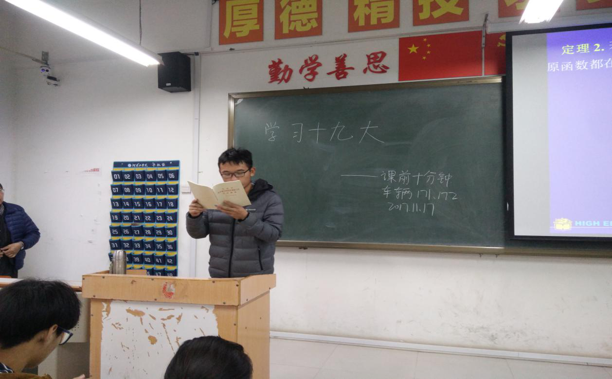 近期,为了学习贯彻党的十九大精神,汽车工程系开展“党的十九大精神进课堂”的课前十分钟活动。汽车工程系2017级所有团支部在各团支部书记的带领下利用课前十分钟认真学习党的十九大精神内容。