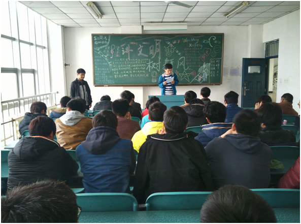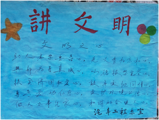积极开展学习礼仪读书活动,礼仪的养成需要学习,没有学习,便无从谈起礼仪规范。为此,我们创设了“人人讲文明,人人重礼仪”的浓厚氛围,各班大力宣讲礼仪,学习礼仪,利用班会时间多次组织学生学习了相关礼仪知识,各班团支书对各班责任教室进行清洁,设计相关主题的黑板报;清理公共信息栏并张贴以文明礼貌为主题的海报。利用板报、漫画、宣讲礼仪知识等途径,让学生掌握一般礼仪的做法,让礼仪知识深深地扎根于学生的心灵。