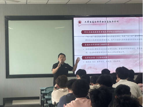 会上,万林宾结合自身参军经历和多年工作经验,详细介绍了近些年部队的改革发展、参军入伍的年龄和身体条件要求、大学生参军入伍的优惠政策、大学生入伍后的职业发展规划以及应届毕业生在校参军的各项福利待遇。在提问互动环节,万老师与同学们进行了深入的交流,对学生关心的入伍地点选择、入伍体检、审批定兵等问题进行了详细解答,同时号召同学们踊跃报名入伍,为祖国国防建设和民族复兴尽一份自己的力量。