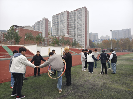 活动现场氛围热烈,精心设计的“齐头并进”“穿越呼啦圈”“信任背人闯关”等多个趣味项目依次开展。在“齐头并进”环节,同学们两两结对,绑住相邻的脚踝,在齐声口号中同步前行,考验着彼此的默契与节奏把控;“穿越呼啦圈”项目里,大家手拉手围成圆圈,在不松手的前提下合力将呼啦圈从一人传递至另一人,欢声笑语中展现了团队协作的智慧;最受关注的“信任背人闯关”环节,由同伴指引方向穿越障碍,每一步都彰显着彼此的信任与担当,不少同学在活动后表示“感受到了被信任的温暖与责任”。